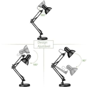 Luminária articulado de mesa -para escritório Design, modernidade e conforto para a sua leitura. A luminária articulável com base para mesa é ideal para você que estuda ou trabalha e preza por um ambiente mais iluminando. A luminária articulada de mesa vai lhe auxiliar, deixando o ambiente mais claro, favorecendo para a sua concentração e foco, e deixando também o ambiente com um visual mais moderno. A luminária abajur de mesa é feita de um material de ótima qualidade e possui em sua estrutura articulações para que assim você possa dirigir o foco de luz para onde desejar. Ela é compatível com lâmpadas e27, possui um sistema bivolt e compacta. A luminária articulável de mesa possui articulações que ajudam a movimentá-la e direcionar o a luz para onde preferir. Atenção: voltagem do produto - bivolt Atenção: acompanha garra de fixação Atenção: não acompanha lampada Especificações: Cor: preto Material: metal Possui interruptor de liga/desliga (localizado na parte do fio que liga na tomada) Compatível com lâmpadas: e27 de até 40 watts. 2 modos de fixação Haste articulável e flexível Bocal de cerâmica Informações técnicas: Potência máxima das lâmpadas que podem ser usadas: (atenção - o produto não acompanha lampas) Led: 18w Incandescente: 60w Eletrônica: 30w Tensão: 60hz Frequência: 0,5 Temp. De operação: -5c á 40 c Índice de proteção: ip40 Dimensões aproximadas (da luminária completa incluindo base): Altura: 60 cm Largura: 14 cm Dimensões aproximadas (da haste articulada): Altura: 47 cm Largura: 4 cm Dimensões aproximadas (do bulbo - cúpula) Altura: 10 cm Largura: 12 cm Comprimento: 13 cm Circunferência: 39 cm Dimensões aproximadas (da base) Altura: 3 cm Largura: 15 cm Circunferência: 49 cm Dimensões aproximadas (da garra) Diâmetro máximo da boca da garra: 4 cm 3 messes de garantia contra defeito de fabricação 1,300kg mod: pix preto