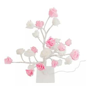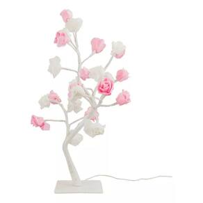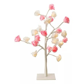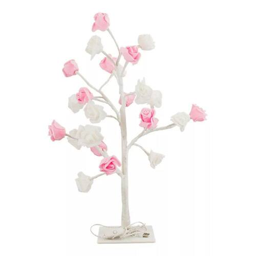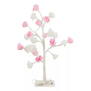 Enfeite decorativo no formato de uma árvore de 31 cm de altura enfeitado com flores brancos e rosas que ao serem ligados emitem luzes. Os galhos da árvore podem ser posicionados em ângulos diferentes. Material: plástico; Funcionamento: cabo USB (incluso)