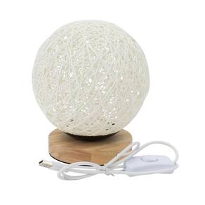 Luminária no formato de uma bola branca em uma base de madeira com 18 cm de altura e 15 cm de diâmetro.