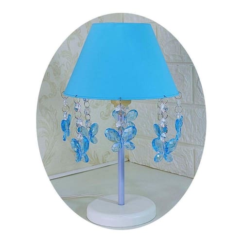 - cúpula de polipropileno plástico resistente na cor azul; - base em acrílico branco; - haste de acrílico branco; - pingentes de borboleta azul; - altura total do abajur 30 cm; - diâmetro maior da cúpula mede 17 cm; - soquete para lâmpadas modelo e-27 bivolt aceita lâmpadas 110v e 220v ; - usar lâmpada de no máximo 40w lâmpada não incluso ; - importante: imagens reais do produto, porém as cores dos pingentes e pérolas podem variar de acordo com cada produto fabricado, conforme disponibilidade Do estoque
