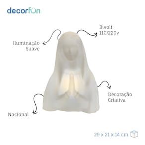 Ilumine seu ambiente com leveza, fé e elegância. A Luminária Busto Nossa Senhora é perfeita para oratórios, quartos ou qualquer espaço que mereça um toque de serenidade e espiritualidade. Além de iluminar, ela funciona como um item decorativo sofisticado, sendo uma excelente opção de presente para todas as idades.