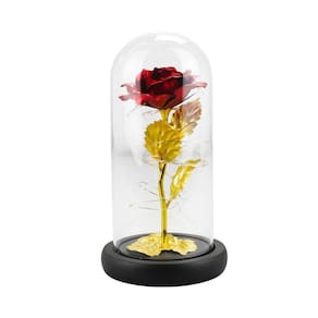 A luminária possui formato cilíndrico e vem decorada com uma rosa e folhas douradas ou na cor vermelha, além de uma base preta que proporciona estabilidade. O botão de liga e desliga é de fácil acesso, permitindo que você controle a iluminação de acordo com a sua preferência.