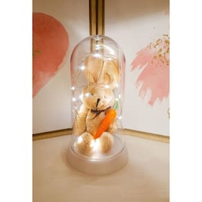 Produto exclusivo amor lindo boutique, fabricação própria, de alta qualidade. Luminária redoma cúpula encantada com coelho de pelúcia com cenoura 19 cm. Especificação técnica: - marca: amor lindo boutique - altura: 19 cm - diâmetro: 10 cm - material da redoma: acrílico e plástico - material da pelúcia: tecido, com enchimento de algodão, não-tóxico. - material da cenoura: plástico - material do fio de led: metais e plástico - cúpula de acrílico translúcido; - base de plástico; - micro luzes de leds / luzes de fadas que, funcionam com apenas 2 baterias cr 2032 já inclusas ;