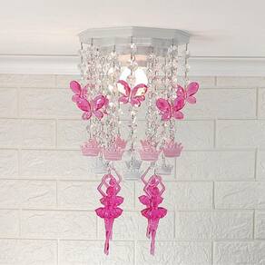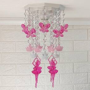 Base Plafon Octogonal de 17 cm em acrílico na cor branca x Altura do lustre 35 cm; Castanhas de acrílico transparente e cor rosa; Borboletas de acrílico cor rosa; Bailarinas de acrílico cor rosa; Coroas de acrílico cor rosa e branca; Voltagem: bivolt 127v 220v Lustre enviado montado pronto para instalação; Lâmpada não inclusa; Marca: Lustres Sh Design Ean: 7806025240574