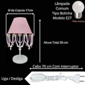 - cúpula de polipropileno plástico resistente na cor rosa bebê; - base em acrílico branco; - haste de acrílico branco; - pingentes de coração, pérolas coloridas, flores; - altura total do abajur 30 cm; - diâmetro maior da cúpula mede 17 cm; - soquete para lâmpadas modelo e-27 bivolt aceita lâmpadas 110v e 220v ; - usar lâmpada de no máximo 40w lâmpada não incluso ; - importante: imagens reais do produto, porém as cores dos pingentes e pérolas podem variar de acordo com cada produto fabricado, conforme disponibilidade Do estoque