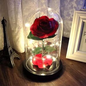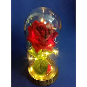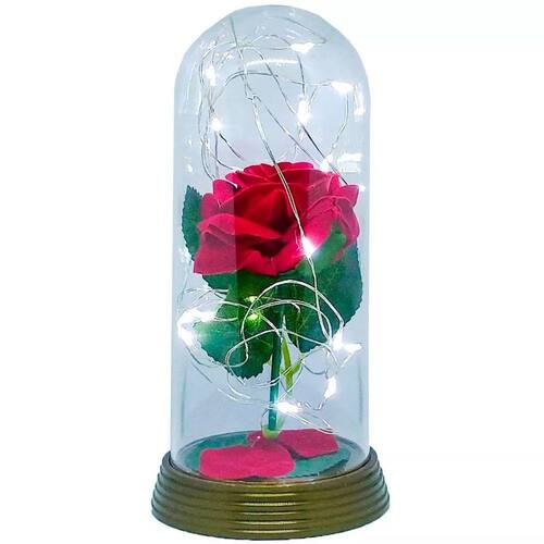 Luminária A Bela e a Fera tem 20 cm de altura, luzes de LED que funcionam com duas baterias pequenas do modelo C2032 inclusas no produto .A rosa interna é feita em veludo e está disponível na cor vermelha.A cúpula é de acrílico e está disponível na cor preta. Funciona com 3 pilhas AA Não inclusas e a energia.Luminária de micro Led's.