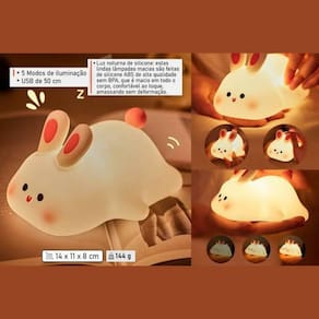 Dimensões: 8 cm altura x 11 cm largura x 14 cm comprimento Material: Plástico, silicone e componentes eletrônicos Luz de toque Tensão nominal: DC 5V Potência: 2W Corrente de entrada: DC 5V = 1A 3 níveis de brilho, tempo de 30 minutos Peso: 143 g Cor: Branca Conteúdo: 01 Luminária de Coelhinho - Branca
