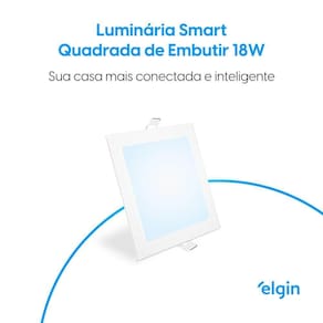 Luminária De Embutir Quadrada Smart - 18W Compatível Com Alexa E Google Home Bivolt A Luminária Inteligente Led Elgin é mais um dispositivo que deixará sua casa conectada. Controle sua Luminária pelo celular, através do aplicativo Elgin Smart de forma simples e rápida, use também o comando de voz para controlar a iluminação usando o Amazon Alexa ou Google Assistente. A Luminária Led tem potência de 18W, vida útil de longa duração e baixo consumo energético. Com ela, você pode ajustar a intensidade da iluminação para cada momento: reduza a luz para assistir um filme na sala ou potencialize para a hora da leitura à noite. Temperatura de cor RGB de 3.000K até 6.500K.Com timer programável, você pode deixar a luz acesa para aumentar a segurança à noite. É só agendar horários específicos para acender ou apagar as luzes. Possui instalação simplificada, não sendo necessário nenhum acessório extra ou mão de obra especializada. Ean: 7897013525896