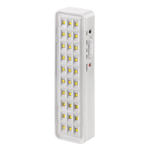 Luminária De Emergência Branco Iluminação Recarregável A luminária 30 LEDs foi fabricada com a tecnologia LED, desenvolvida para iluminação de emergência. Pode ser utilizada em ambientes internos e é ideal para escritórios, hotéis, restaurantes, estabelecimentos comerciais, residências entre outros. Possui bateria de lítio, que proporciona uma vida útil mais longa e uma melhor performance do produto. Seu design moderno foi pensado para que se adeque aos mais diversos ambientes, harmonizando com a arquitetura do espaço e trazendo ainda mais elegância ao projeto. Econômica, proporciona autonomia com maior durabilidade e ótima iluminação. Pode ser facilmente instalada, manuseada e transportada. Acende automaticamente na falta de energia elétrica. Informações TÉCNICAS: Fluxo luminoso máximo: 100 lúmens Quantidade de LEDs: 30 Área de Cobertura: 25m Led indicativo de funcionamento: Sim Seleção de fluxo máx. E min.: Sim Bateria: 3.7 V 500 mAh Alimentação: 100-240 V 50-60 Hz Consumo de energia: 1 W Autonomia: 2,5 horas máx//5 horas mín Temperatura de operação: -10C a 60 C 01h70C Temperatura de cor do LED: 5700 K - 8000 K Grau de proteção: IP20 Peso: 125 g Dimensões: 175 x 49 x 25 mm Materiais de construção: PP/PS Botão de teste: Sim Marca: Não Informado Ean: 7905609823520