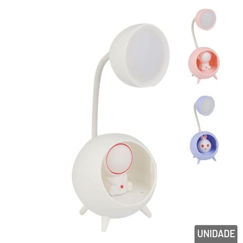 Luminária de Mesa 26cm EM LED Personagens So Para combinar com a tendência e deixar o ambiente encantado, esta luminária tem um design Lúdico, com o formato de Cápsula e Personagens dentro dela, com detalhes em que vai deixar seu ambiente iluminado e enfeitado.\nProporciona luz de LED, branco frio, rotação 360° e com 2 níveis de Luz, uma Luz projetada dentro do personagem, e outra projetada por uma luminária.\nAcompanha cabo de alimentação USB;\nDisponível nas cores: Lilás, Branca, Rosa.\nEspecificações:\nMarca : FU XING\nTipo de material : Plástico, Componentes Eletrônicos\nCores ou Estampa :\nDimensões do Produto : 26 X 9 X 8,5 CM\nDimensões da Embalagem : 15 X 10 X 9 CM\nPeso Bruto (Gramas) : 0.180
