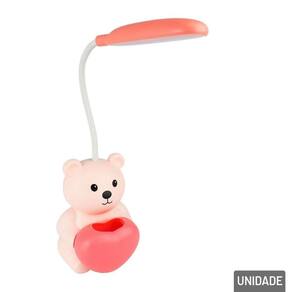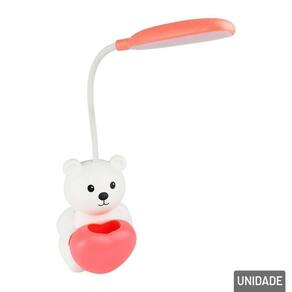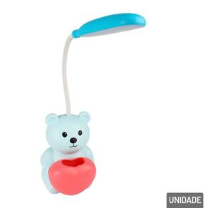 Luminária de Mesa 32cm EM LED Urso e Coraç� Transforme qualquer ambiente com essa luminária de mesa encantadora em formato de urso com coração color. Com um design criativo, funcional e super fofo, ela é perfeita para quartos infantis, escritórios, home office, ou como presente especial.\nA base da luminária inclui um porta-objetos em formato de coração, ideal para guardar canetas, lápis, clipes, maquiagem ou o que você quiser manter por perto com estilo e organização. Ajuste a direção da luz com facilidade. A haste flexível permite rotacionar e direcionar a luminária como preferir. conta com bateria recarregável via USB, garantindo mobilidade total e economia de energia.\nDisponível em cores.\nEspecificações:\nMarca : TINGS\nTipo de material : Componentes Eletrônicos, Plástico\nCores ou Estampa : Color\nDimensões do Produto : 32 X 7 X 8,5 CM\nDimensões da Embalagem : 16 X 9 X 9 CM\nPeso Bruto (Gramas) : 0.143