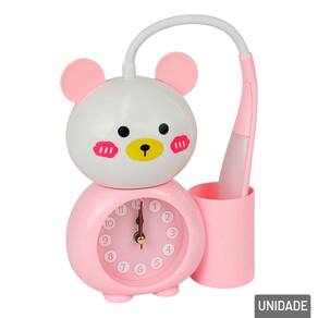 Luminária de Mesa 45cm EM LED com Despertado Dê um toque de fofura, funcionalidade e tecnologia ao seu espaço com a Luminária de Mesa em LED, equipada com relógio analógico, despertador e duas opções de iluminação. Ideal para quartos infantis, escritórios modernos ou qualquer ambiente que combine charme com praticidade.\nCom formato de Ratinho fofo, esta luminária é perfeita para encantar crianças, adolescentes ou adultos que amam itens decorativos com personalidade. A luminária pode ser alimentada via cabo USB (Incluso), compatível com carregadores de celular, computadores e power banks. Relógio é alimentado por uma 1x Pilha AA (Não Inclusa).\nEstrutura articulável, o braço da luminária permite ajuste de ângulo, direcionando a luz conforme a necessidade.\nEspecificações:\nMarca : TINGS\nTipo de material : Componentes Eletrônicos, Plástico\nCores ou Estampa : Branco, Rosa\nDimensões do Produto : 45 X 15 X 8,5 CM\nDimensões da Embalagem : 21 X 15 X 9,5 CM\nPeso Bruto (Gramas) : 0.318