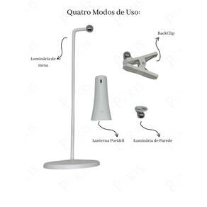 - Quatro modos de uso: luminária de mesa convencional, luminária de mesa backclip, luminária de parede direcionável e lanterna de emergência portátil.