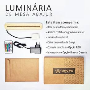 Decore e ilumine seu ambiente com muito estilo e personalidade. Ótima opção para quem deseja decorar o ambiente com muito bom gosto e deixar sua casa ainda mais bonita. A arte de decorar vai deixar o seu espaço mais acolhedor, moderno e, principalmente, com a sua cara. Características: - Base de madeira com fita led - Acrílico com gravação a laser - Tomada Bivolt - Controle remoto no produto com a Opção RGB Especificações técnicas: Marca: Davys Creative Modelo: Luminária Abajur Cor opcional: RGB colorido Ambientes Recomendados: Interno Acompanha Caixa personalizada Davys Dimensões: 25x17x5 : 30 dias FABRICAÇÃO PRÓPRIA Ean: 7898928709722