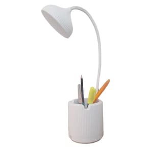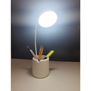 A haste flexível permite o direcionamento do foco de luz para o local desejado com facilidade. A Luminária também conta com um suporte para celular e um porta canetas e objetos. Além disso, ela tem três níveis de luminosidade, se tornando adequada para diversas ocasiões.