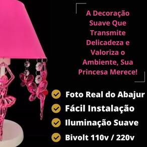 Lindo Abajur Infantil de Borboletas e Bailarinas Rosa Pink Especificações: - Cúpula de Polipropileno Plástico Resistente na Cor Rosa Pink; - Base em Acrílico Branco - Haste de acrílico branco - Pingentes Bailarinas e Borboletas na Cor Rosa Pink; - Argolas de Inox, Castanhas de Acrílico Transparente de Alto Brilho; - Altura Total do Abajur 27 cm - Diâmetro Maior da Cúpula mede 17 cm - Soquete para Lâmpadas Modelo E-27 bivolt aceita lâmpadas 110v e 220v - Usar Lâmpada de no Máximo 40W Lâmpada Não Incluso - IMPORTANTE: Imagens reais do produto, porém as cores dos pingentes e pérolas podem variar de acordo com cada produto fabricado, conforme disponibilidade Do Marca: Não Informado