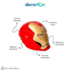 Transforme seu espaço com a força e a tecnologia do Homem de Ferro! A Luminária de Mesa Capacete Homem de Ferro Marvel traz todo o carisma do gênio, bilionário e herói para a sua decoração. Com um design fiel ao icônico capacete do Iron Man, ela proporciona um toque moderno e geek para escritórios, quartos e setups gamers.