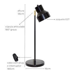 A Luminária de Mesa Cate é mais do que apenas uma fonte de luz. É uma peça de design que combina a elegância do metal com a funcionalidade da iluminação direcionada. Perfeita para quem busca um toque sofisticado em seus ambientes. Características que fazem a diferença: Design atemporal: As linhas clean e o acabamento impecável da Cate a tornam uma peça atemporal, que se adapta a diversos estilos de decoração.Material de alta qualidade: Construída em alumínio e ferro com pintura eletrostática, a Cate é resistente à corrosão, garantindo durabilidade e beleza por muitos anos.Iluminação versátil: O soquete E27 permite a utilização de uma ampla variedade de lâmpadas LED (não inclusas).Articulação precisa: A cúpula articulada em 180° permite direcionar a luz exatamente onde você precisa, ideal para leitura, trabalho ou destacar objetos decorativos.Facilidade de uso: O cabo com plug e interruptor integrado de 180cm facilita a instalação e o manuseio.Bivolt: Adapta-se a qualquer tomada, sem a necessidade de adaptador.Resistente à maresia: Sim.Cuidados e Manutenção: Para preservar a luminária, utilize um pano seco e macio para limpeza. Evite o uso de produtos abrasivos e solventes que possam danificar o acabamento. Ideal para: Escritórios: Crie um ambiente de trabalho moderno e inspirador.Quartos: Ilumine sua cabeceira e adicione um toque industrial à decoração.Salas de estar: Destaque obras de arte ou crie pontos de leitura aconchegantes.Ambientes comerciais: Proporcione uma iluminação elegante e funcional em lojas, restaurantes e hotéis. Por que escolher a Luminária Cate? Design industrial: Um toque de sofisticação para qualquer ambiente.Durabilidade e resistência: Construída para durar.Versatilidade: Ideal para diversos ambientes e estilos de decoração.