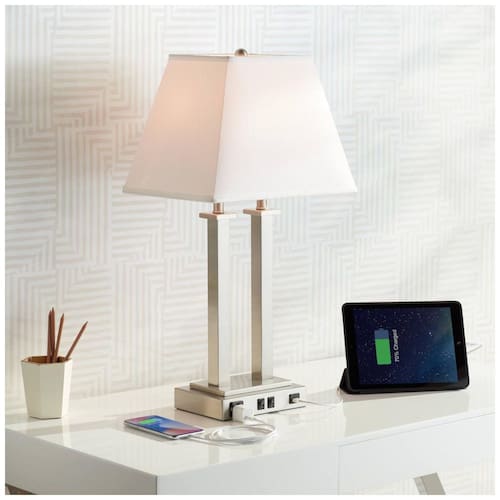 A sombra tem 4 1, 2 de largura e 6 de profundidade na parte superior x 7 de largura e 11 de profundidade na parte inferior x 10 de altura. Usa duas lâmpadas de base padrão média máxima de 60 watts não incluídas. Soquetes de luz controlados individualmente. Interruptores basculantes on off na base. Candeeiro de secretária USB com porta USB tipo 2A incorporada e tomada na base. eres Marca: Não Informado