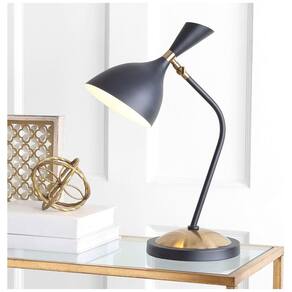 Esta luminária de mesa combina a estética icônica de meados do século com um toque moderno e elegante. Com uma cúpula inspirada na era Space Age e uma base angular, ela proporciona um visual divertido e sofisticado. Os detalhes em latão dourado sobre um acabamento em metal preto adicionam um toque de classe, enquanto o soquete giratório permite ajustar a luz no ângulo ideal.