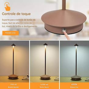 Essa luminária possui 3 tons e controle de intensidade de cor. Para mudar basta pressionar o botão na base para mudar a tonalidade, para controlar a intensidade basta pressionar o mesmo botão.