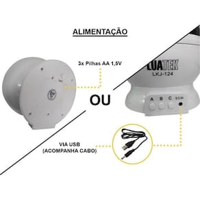 - funciona com 4 pilhas aaa não inclusas ou conectado no usb na energia;
