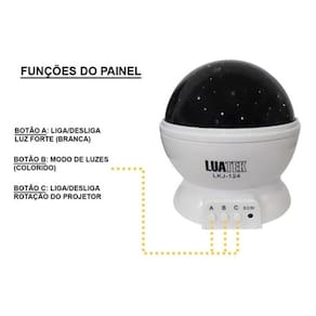 Descrição: É ideal para quem vive sonhando com estrelas ou curte um belo céu estrelado. Ideal para quarto de crianças e bebês, proporciona um soninho tranquilo, ao mesmo tempo em que desperta sua imaginação e curiosidade natural. Jovens e adultos também podem desfrutar de bons momentos aproveito o brilho e a luminosidade. Ideal para baladas, festas de aniversário, momentos românticos ou simplesmente para aproveitar um tempo em família. Graças as opções de cores e movimento, o céu estrelado deixa espaço para a sua criatividade. Crie um ambiente mágico de noite estrelada, com cintilantes estrelas estáticas ou em movimento. Além disso, ao colocar a cobertura branca concentra os efeitos dentro da própria luminária, podendo ser opção de abajur estrelado.