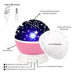 Descrição: É ideal para quem vive sonhando com estrelas ou curte um belo céu estrelado. Ideal para quarto de crianças e bebês, proporciona um soninho tranquilo, ao mesmo tempo em que desperta sua imaginação e curiosidade natural. Jovens e adultos também podem desfrutar de bons momentos aproveito o brilho e a luminosidade. Ideal para baladas, festas de aniversário, momentos românticos ou simplesmente para aproveitar um tempo em família. Graças as opções de cores e movimento, o céu estrelado deixa espaço para a sua criatividade. Crie um ambiente mágico de noite estrelada, com cintilantes estrelas estáticas ou em movimento. Além disso, ao colocar a cobertura branca concentra os efeitos dentro da própria luminária, podendo ser opção de abajur estrelado.