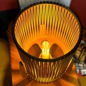 A cúpula é feita de MDF laminado Freijó, complementada por acetato e tecido, oferecendo uma iluminação difusa e suave que realça qualquer ambiente, projetada com um estilo ripado que confere um visual contemporâneo e elegante. Os desenhos internos proporcionam uma iluminação difusa e atraente, realçando a beleza da luminária.