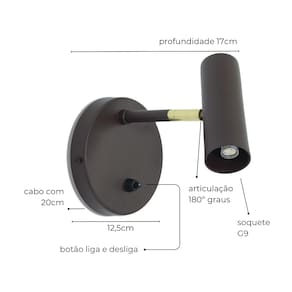 A luminária Sofhie é a escolha ideal para quem busca combinar design sofisticado e funcionalidade. Desenvolvida com precisão, esta peça é perfeita para iluminar ambientes internos com estilo e eficiência. Características Principais: Material: Estrutura robusta em alumínio e ferro, proporcionando durabilidade e uma estética moderna.Pintura: Acabamento em pintura eletrostática que confere resistência a corrosão e desgaste, mantendo o visual impecável por mais tempo.Tipo de Soquete: G9, compatível com lâmpadas bipino halopim em LED (lâmpada não incluída), garantindo eficiência energética e flexibilidade na escolha das lâmpadas.Articulação da Cúpula: Permite ajuste de 180º, oferecendo versatilidade no direcionamento da luz para atender suas necessidades de iluminação.Tensão: Bivolt, adaptando-se facilmente a diferentes tensões elétricas (110V e 220V) para maior flexibilidade na instalação.Botão Liga e Desliga: Equipado com botão na base para maior praticidade e controle da iluminação.Resistente a Maresia: Adequada para ambientes com alta umidade, garantindo longevidade e bom desempenho.Cabo: Inclui cabo de 20 cm para instalação, facilitando a montagem e ajuste do posicionamento da luminária.Áreas Indicadas para Uso: Exclusivamente para ambientes internos, proporcionando uma iluminação eficaz e confortável.