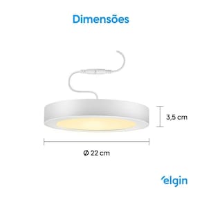 Luminária De Sobrepor Redonda Smart - 18W Compatível Com Alexa E Google Home Bivolt A Luminária Inteligente de Sobrepor Led Elgin é mais um dispositivo que deixará sua casa conectada. Controle sua Luminária pelo celular, através do aplicativo Elgin Smart de forma simples e rápida, use também o comando de voz para controlar a iluminação usando o Amazon Alexa ou Google Assistant. A Luminária Led tem potência de 18W, vida útil de longa duração e baixo consumo energético. Com ela, você pode ajustar a intensidade da iluminação para cada momento, reduza a luz para assistir um filme na sala ou potencialize para a hora da leitura à noite.Temperatura de cor RGB de 3.000K até 6.500K. Com timer programável, você pode deixar a luz acesa para aumentar a segurança à noite. É só agendar horários específicos para acender ou apagar as luzes. Possui instalação simplificada, não sendo necessário nenhum acessório extra ou mão de obra especializada. Ean: 7897013527081