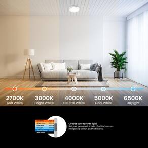 - 5 CONFIGURAÇÕES DE TEMPERATURA DE COR SELECIONÁVEIS — Personalize sua iluminação com um simples toque no botão. Escolha entre 5 temperaturas de cor ajustáveis (2700K de branco suave, 3000K de branco quente, 3500K de branco neutro, 4000 K de branco frio e 5000 K de luz natural) para criar a atmosfera perfeita para qualquer atividade. Se você deseja uma luz quente e aconchegante para relaxar ou luz do dia para tarefas e leitura, esta luminária de teto LED se adapta às suas necessidades.