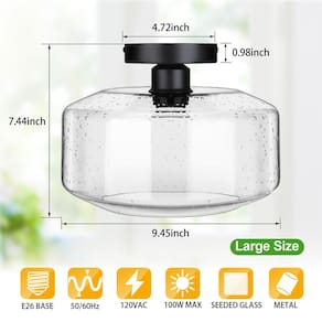 SunRider Luminária de teto de montagem semi-embutida industrial, abajur de vidro semeado, luminária preta moderna de fazenda para corredor, cozinha, quarto, GG Apresentações: Luminária de teto semi-embutida com sombra de vidro semeada, uma iluminação ideal para sua casa Especificações: Tensão: 110-120V Potência: Max 100W Frequência: 60Hz Base do soquete: E26 Material: Metal, Vidro Estilo: Clássico/Moderno/Industrial Fonte de alimentação: Com fio elétrico Modo de instalação: Montagem no teto Lâmpadas não incluídas Dimensões: Diâmetro da persiana de vidro: 9,45 polegadas/240 mm Diâmetro do dossel: 4,72 polegadas/120 mm Altura da lâmpada: 189 mm Lâmpadas recomendadas: O soquete de base E26 é compatível com várias lâmpadas, como LED, INCANDESCENTE, CFL. Lâmpadas Edison recomendadas (lâmpada não incluída). Leva uma lâmpada de base média E26 de 60 watts no máximo (não incluída). Aplicações recomendadas: Banheiro, cozinha, porão, hotel, lavabo, restaurante, quarto, sala de estudo, casa de fazenda, sala de estar, mudroom, sala de hóspedes, cozinha, sala de jantar, quarto de crianças, berçário, despensa, escritório em casa, oficina, loja, escritório, corredor, entrada, varanda, bar, café, hall de entrada, hall de entrada, sala de lamas, quarto de hóspedes, galera, sótão, porão, garagem, escada, escada A embalagem inclui: 1 luminária de teto 1 kit de ferramentas. 1 x manual do usuário (idioma português não garantido). Aviso: Corte a energia antes de instalar ou limpar a luz. A luz suporta até 60 watts no máximo por soquete. Não coloque a luminária em condições de trabalho de superaquecimento ou jogue no fogo. Não retrofit o produto, a lâmpada não está incluída. - Tamanho extra grande atualizado e estilo vintage: A luz de teto de montagem semi-embutida foi melhorada em relação ao seu tamanho autêntico (diâmetro da persiana de vidro: 9,45 polegadas/240 mm, diâmetro da persiana: 4,72 polegadas/120 mm, altura da lâmpada: 7,44 polegadas/189 mm) apresenta um abajur de vidro semeado exclusivo e uma base de metal preto fosco resistente à ferrugem clássica que traz um toque moderno à sua Avantant -Garde design retrô. O design de vidro bolha suaviza a luz e reduz os danos aos olhos. - Amplas aplicações e decoração perfeita: o abajur de vidro requintado e o design de base fosca retrô, as luzes de teto semi-embutidas são ideais para corredores, entradas, varandas, salas de lama, escadas, cozinhas, armários, quartos infantis, salas de jantar, quartos, salas de estar, não apenas as áreas domésticas, mas também uma escolha ideal para áreas comerciais: bares, cafés, escritórios, hotéis e restaurantes. - Instalação fácil e rápida para uso conveniente e seguro: o pacote inclui todas as ferragens de instalação e parafusos para tornar sua experiência de instalação mais fácil e rápida. Com instruções passo a passo, a instalação da iluminação de teto é realmente simples, não se preocupe mais com a dificuldade de instalar. - Soquete de base média E26 e compatível com várias lâmpadas E26 (lâmpada não incluída): a luminária pendente de montagem embutida com soquete padrão dos EUA é compatível com lâmpadas de base média E26 (lâmpada não incluída), como lâmpadas incandescentes, LED, CFL e halogêneas (a potência máxima da lâmpada é de 100 W). Escolha a lâmpada que você gosta para decorar sua casa aconchegante. - Tamanho ideal e segurança de qualidade: a base de metal moderna e a luz de teto de vidro semeado são adequadas para todos os tipos de decoração de iluminação de ambientes. Nossas luzes são dedicadas a rigorosos padrões de excelência de fabricação para manter a qualidade e a segurança do produto.
