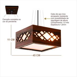Luminária decorativa madeira pendente pipa 45cm Cor: pau ferro A iluminação certa pode transformar um ambiente, deixando-o mais requintado, confortável e aconchegante. Nossas luminárias são criadas e desenvolvidas com a intenção fazer essa transformação, pois são construídas com material de primeira e com projetos muito bem elaborados, unindo beleza, funcionalidade e bom gosto. Conseguimos com elas, fazer o casamento do acrílico, alumínio e madeira de maneira harmônica. Especificações técnicas Dimensões: Comprimento: 45 cm Largura: 45 cm Altura: 11 cm Peso: 3,5 kg Qtde de lâmpadas: 3 led 6 a 15 w Alimentação: bivolt 110/220 Material: Difusor em acrílico leitoso Mdf primeira qualidade Soquete e27 Fio de ligação cobre 1,5mm Acessórios de fixação e sustentação Cor mdf: marron pf Limpeza: utilizar um pano macio flanela levemente umedecido com água ou lustra móveis : 6 meses contra defeito de fabricação. Marca: creatus Ambientes Residenciais Nossas luminárias podem ser instaladas em qualquer cômodo da casa, pois com certeza tornará o ambiente mais bonito e harmonioso. Empresas As nossas luminárias também tem a função de alegrar ambientes empresariais, pois deixam o ambiente mais leve bonito e suave. Embalagem Nossas luminárias são muito bem embaladas, fazendo com que os riscos no transporte sejam reduzidos a quase nada. Caso acontecer um eventual dano no transporte, fazemos a reposição sem custo. Observação - lâmpadas não inclusas - utilizar somente lâmpadas de led - acompanha manual de instalação - acompanham os soquetes e o fio necessário para a instalação da luminária na rede elétrica. - uso exclusivo para ambiente interno Ean: 7893804009248