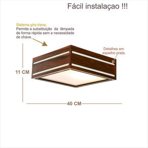 Luminária Decorativa Madeira Plafon Ilhota Mirror 40cm Cor: Pau Ferro A iluminação certa pode transformar um ambiente, deixando-o mais requintado, confortável e aconchegante. Nossas luminárias são criadas e desenvolvidas com a intenção fazer essa transformação, pois são construídas com material de primeira e com projetos muito bem elaborados, unindo beleza, funcionalidade e bom gosto. Conseguimos com elas, fazer o casamento do acrílico, alumínio e madeira de maneira harmônica. ESPECIFICAÇÕES TÉCNICAS DIMENSÕES: Comprimento: 40cm Largura: 40 cm Altura: 11 cm Peso: 3,5 kg Qtde de lâmpadas: 3 led 6 a 15 W Alimentação: Bivolt 110/220 MATERIAL: Difusor em acrílico leitoso Mdf primeira qualidade Soquete E27 Fio de ligação cobre 1,5mm Acessórios de fixação e sustentação Cor mdf: Marron PF Detalhes: Espelho acrílico prata Limpeza: Utilizar um pano macio flanela levemente umedecido com água ou lustra móveis : 6 meses contra defeito de fabricação. Marca: Creatus AMBIENTES RESIDENCIAIS Nossas luminárias podem ser instaladas em qualquer cômodo da casa, pois com certeza tornará o ambiente mais bonito e harmonioso. EMPRESAS As nossas luminárias também tem a função de alegrar ambientes empresariais, pois deixam o ambiente mais leve bonito e suave. EMBALAGEM Nossas luminárias são muito bem embaladas, fazendo com que os riscos no transporte sejam reduzidos a quase nada. Caso acontecer um eventual dano no transporte, fazemos a reposição sem custo. OBSERVAÇÃO - Lâmpadas não inclusas - Utilizar somente lâmpadas de LED - Acompanha manual de instalação - Acompanham os soquetes e o fio necessário para a instalação da luminária na rede elétrica. - Uso exclusivo para ambiente interno