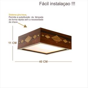 Luminária Decorativa Madeira Plafon Maresias Nog 40cm Cor: Pau Ferro A iluminação certa pode transformar um ambiente, deixando-o mais requintado, confortável e aconchegante. Nossas luminárias são criadas e desenvolvidas com a intenção fazer essa transformação, pois são construídas com material de primeira e com projetos muito bem elaborados, unindo beleza, funcionalidade e bom gosto. Conseguimos com elas, fazer o casamento do acrílico, alumínio e madeira de maneira harmônica. ESPECIFICAÇÕES TÉCNICAS DIMENSÕES: Comprimento: 40cm Largura: 40 cm Altura: 11 cm Peso: 3,5 kg Qtde de lâmpadas: 3 led 6 a 15 W Alimentação: Bivolt 110/220 MATERIAL: Difusor em acrílico leitoso Mdf primeira qualidade Soquete E27 Fio de ligação cobre 1,5mm Acessórios de fixação e sustentação Cor mdf: Marron PF Detalhes: Mdf Nogueira Limpeza: Utilizar um pano macio flanela levemente umedecido com água ou lustra móveis : 6 meses contra defeito de fabricação. Marca: Creatus AMBIENTES RESIDENCIAIS Nossas luminárias podem ser instaladas em qualquer cômodo da casa, pois com certeza tornará o ambiente mais bonito e harmonioso. EMPRESAS As nossas luminárias também tem a função de alegrar ambientes empresariais, pois deixam o ambiente mais leve bonito e suave. EMBALAGEM Nossas luminárias são muito bem embaladas, fazendo com que os riscos no transporte sejam reduzidos a quase nada. Caso acontecer um eventual dano no transporte, fazemos a reposição sem custo. OBSERVAÇÃO - Lâmpadas não inclusas - Utilizar somente lâmpadas de LED - Acompanha manual de instalação - Acompanham os soquetes e o fio necessário para a instalação da luminária na rede elétrica. - Uso exclusivo para ambiente interno Ean: 7893804009101