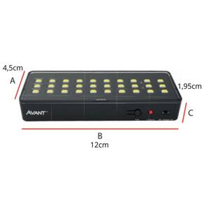 - Marca: Avant; - Referência: 354251374; - Material: Corpo e difusor em polipropileno; - Potência: 1W; - Cor da luz: 6000K (Branco frio); - Fluxo luminoso: 100lm; - Tensão: Bivolt; - Número de Leds: 30; - Índice de Proteção: IP20; - IRC (Índice de Reprodução de Cor): > 80; - Ângulo de abertura: 150; - Fator de potência: >0,40; - Bateria: 3.7V 0.5AH Lítio; - Frequência: 50-60Hz; - Temperatura de operação: -10C a +40C; - Tempo de carregamento: 24h; - Autonomia: Até 2 horas; - Vida útil: 15 mil horas; - Garantia: 12 meses.