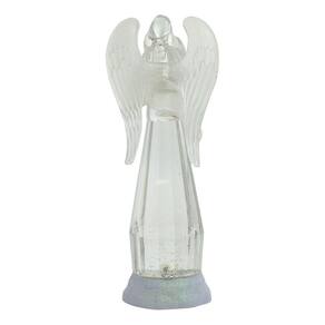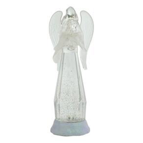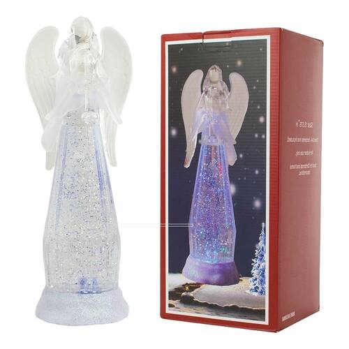 Enfeite decorativo na imagem de um Anjo segurando uma trombeta com 34 cm de altura. Corpo do Anjo acende luzes que vão alternando cores e movimentando a purpurina no interior do corpo. Material: plástico; Funcionamento: 3 pilhas AA
