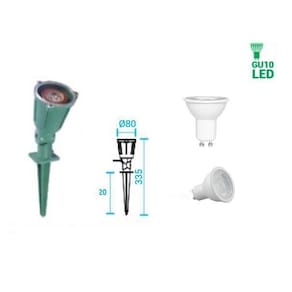 Tipo de Lâmpada: Led Gu10 - Potência máxima 10w Tipo de Soquete: GU10 Cor: Verde Comprimento total: 33,5cm Comprimento da haste: 20cm Diâmetro: 8cm Tensão: 127-220V Soquete em porcelana; Marca: Olivo Produto: Espeto de Jardim Tipo de Material: Plástico - Nylon Quantidade de Lâmpadas: 1 Com sensor de movimento: Não É à prova d'água: Sim Contém lente de vedação em policarbonato na cúpula onde é inserida a lâmpada;