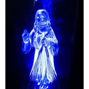 Detalhes: 13 cm de altura; 7 cm de diâmetro; Base de Plástico na cor ouro envelhecido; Imagem de acrílico; Detalhes dourados. LED na cor Azul; Funciona com 1 bateria, já inclusa.
