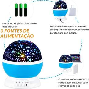 Fácil de usar: O projeto foi pensado para ser simples e prático. A Luminária Projetor Estrela Galaxy pode ser alimentada de duas maneiras: utilizando o cabo de energia para uma experiência contínua ou, se preferir, utilizando pilhas, proporcionando maior comodidade e a possibilidade de levar o projetor para qualquer lugar.