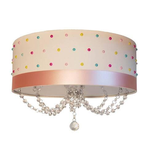 Luminária plafon pérolas coloridas 50x15 Modelo de sobrepor; ideal para compor a decoração do quarto, proporcionando uma boa iluminação; Cúpula produzida em psai de alto impacto com acabamento em tecido de algodão na tonalidade cru e detalhes de fita em laminado pet flexível com meia pérolas coloridas alocadas por toda a extremidade da cúpula. Faixa em pet cor rosa Capacidade para 3 lâmpadas rosca comum led e-27 12w não inclusas Fechamento total Correntes com cristais k9 e bola 30mm k9; Embalagem: caixa de papelão