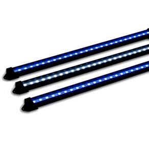 Conteúdo do kit: Suportes em acrílico reguláveis, com 05cm de altura para aquários sem tampa; Fonte bivolt; Cabos elétricos; Cabo extensor dimmer com 08 estágios, efeitos e botão on/off; 03 linhas compostas por calha dissipadora de alumínio, lentes transparentes, ponteiras e barra de leds smd implantados em alumínio com 50cm cada;