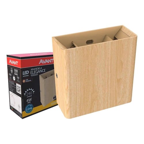 Características Adicionais: Luminária LED tipo arandela com acabamento efeito madeira Indicada para uso interno e externo (IP65) Potência de 4W com fluxo luminoso de 240 lúmens Corpo e difusor em policarbonato Ângulo de abertura ajustável de 10° a 90° Instalação por sobrepor Baixo consumo de energia Fator de potência: 0,50 Temperatura ambiente de operação: -5°C a 40°C 1 ano de garantia