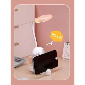 Luminária de Led carregável em USB, com bolsinho atrás para colocar lápis, canetas, etc e serve como porta-celular. Botão Liga-desliga