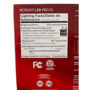 Especificações Técnicas: • Marca: Kian • Linha: Retrofit LED PRO ES • Modelo: #10DLS5/6DIM927LT50EL • EAN: 811037030034 • Potência: 10W • Equivalência: substitui 65W • Fluxo luminoso: 700 lm • Cor da luz: 2700K Warm White • IRC: 90 • Base: E26 • Tensão: 120V • Dimerizável: Sim • Vida útil: 45,7 anos (50.000 horas) • Economia estimada: US$ 302,5 • Instalação: luminárias 5"/6" • Áreas úmidas: adequado (wet location) • Material: policarbonato resistente a impactos • Certificação: Energy Star • Garantia: 5 anos