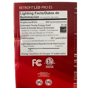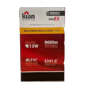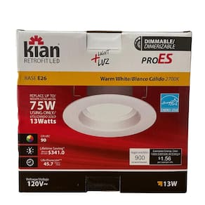 Especificações Técnicas: • Marca: Kian • Linha: Retrofit LED PRO ES • Modelo: #13DLS5/6DIM927LT50EL • EAN: 811037030041 • Potência: 13W • Fluxo luminoso: 900 lm • Cor da luz: 2700K Warm White • Base: E26 • Equivalência: até 75W • Tensão: 120V • IRC: 90 • Dimerizável: Sim • Vida útil: 50.000 horas (˜45,7 anos com uso de 3h/dia) • Economia estimada: US$ 341 • Aplicação: luminárias 5” e 6”; áreas úmidas • Instalação: molas integradas • Material: policarbonato resistente • Temp. mínima operação: -30°C • Certificações: Energy Star, FCC, ETL, Intertek • Garantia: 5 anos