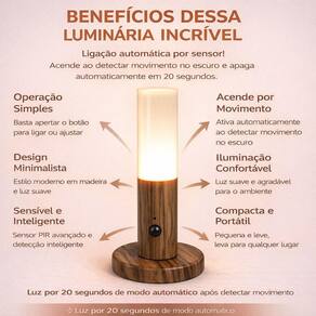 A Luminária LED Inteligente com Sensor de Movimento é a solução definitiva para quem busca iluminação estratégica, economia e sofisticação em um único dispositivo. Desenvolvida para facilitar a rotina, ela elimina a necessidade de interruptores manuais em locais escuros, acendendo automaticamente ao detectar sua presença. Com um design minimalista e acabamento que remete à madeira, esta peça não apenas ilumina, mas também decora o ambiente, integrando-se perfeitamente a quartos, closets, escadas e corredores.