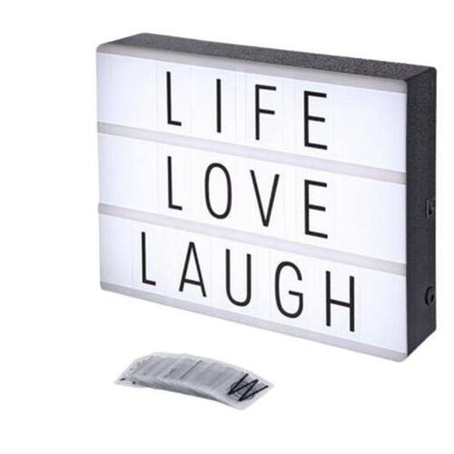 Luminária Letreiro De Cinema A5 + 85 Letras, Números, ÍconesNo estilo cinema antigo.Ideal para decorações para sua casa, festas, casamentos, quarto do bebê, vitrine de lojas, ou o que mais sua imaginação permitir.Painel para inserir letras, ícones e símbolos.Fazendo toda a diferença, trazendo mais personalidade ao seu ambiente.Podendo ser usada em cima da mesa ou pendurado na parede.Informações Adicionais: Material: Plástico Tamanho: A5 21 X 15 X 4 CM Itens Inclusos : 1 Luminária Led A5 Não vem acompanhado o adaptador de USB para tomada + 85 Letras, Números, Ícones Luz Cor Branca. Pilha AAAA Não inclusa