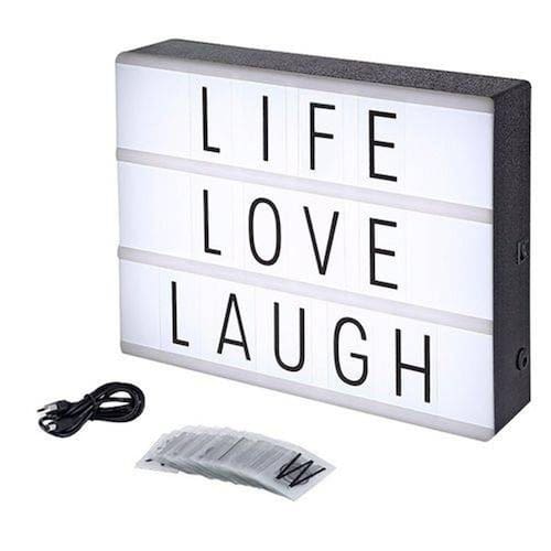 Luminária Led Lightbox Cinema A4 + 96 Letras e NúmerosColoque suas mensagens pessoais no centro das atenções com esta caixa de luz. São três painéis para inserir letras, ícones ou símbolos, permitindo que você coloque a frase que você quiser ou exiba seus ícones favoritos.Itens inclusos:- Luminária Light Box,- 96 slides letras, números e símbolos ,- Cabo USB.Tamanho:- 30cm x 22cm x 4cm,- A4Energia:- Cabo Usb Incluso ou Pilha AA Não inclusa